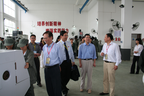 9月24日上午10点50分,省教育厅本科教学工作水平评估诊断性评价专家张志沛、汤放华、陈小明、彭小奇、皮修平、蒋易春、黄圣生,王玺功、高协平、李孟仁、王文斌等一行在公司领导谢伯端、刘国荣、刘国繁以及教务处处长长秦祖泽、评估办主任宋欣荣等的陪同下,集体考察了南校区工程训练中心。专家组考察了工程训练中心的加工中心、数控车床、线切割机床、激光雕刻机、电火花成型机,普通车、铣、磨床,铸锻车间,电焊、热处理、钳工、电工、电子实习等基地,工程训练中心负责人在工程训练中心大门前热情迎接并向专家进行了详细解说。