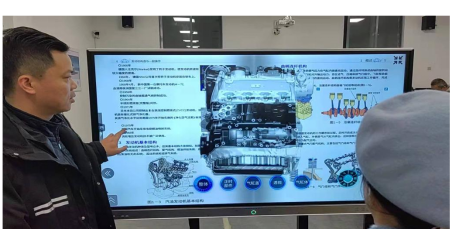 随后,中心一行对中车、大众、宝马、智能制造中心等校企合作场地进行了参观考察。在大众实训基地,该校车辆运用公司周定武经理为大家演示了由公司师生自主研发的VR活页教材,其生动直观的教学方式让大家眼前一亮。